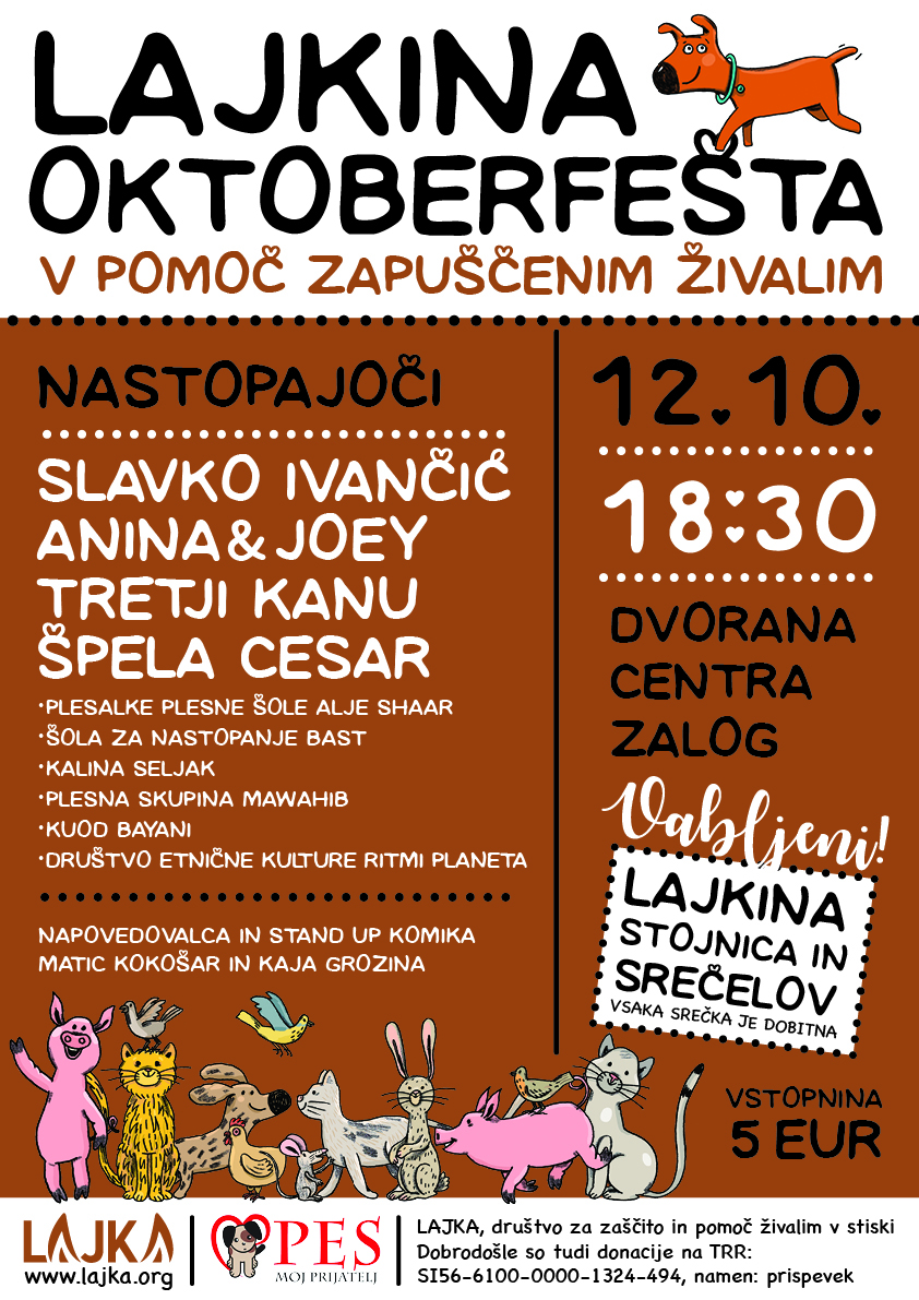 Prihaja jesen in z njo Lajkin dobrodelni dogodek leta. Čas je za spremembe in zgodila se bo 1. LAJKINA OKTOBERFEŠTA. Organizirali smo jo na petek, da si boste po našem druženju lahko v soboto pošteno odpočili. 🙂 Tudi epicenter dogajanja je spremenjen: Center Zalog, Zaloška cesta 267. Seveda pa naš tradicionalni srečelov ostane tak, kot je bil – bogat in živalim, ljudem ter okolju prijazen 🐾👨‍👩‍👧‍👦🌏.
