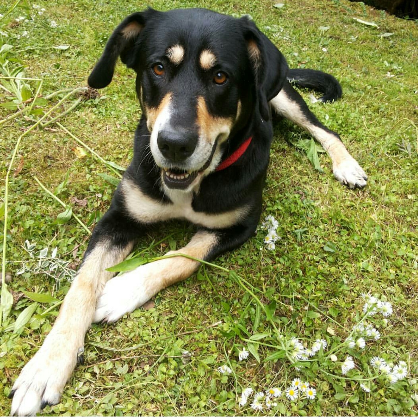 Emy je večje rasti (43 kg), je mešanka s švicarskim planšarskim psom. Je prijazna in mirna, obožuje otroke, s pasjo družbo nima nobenih težav.